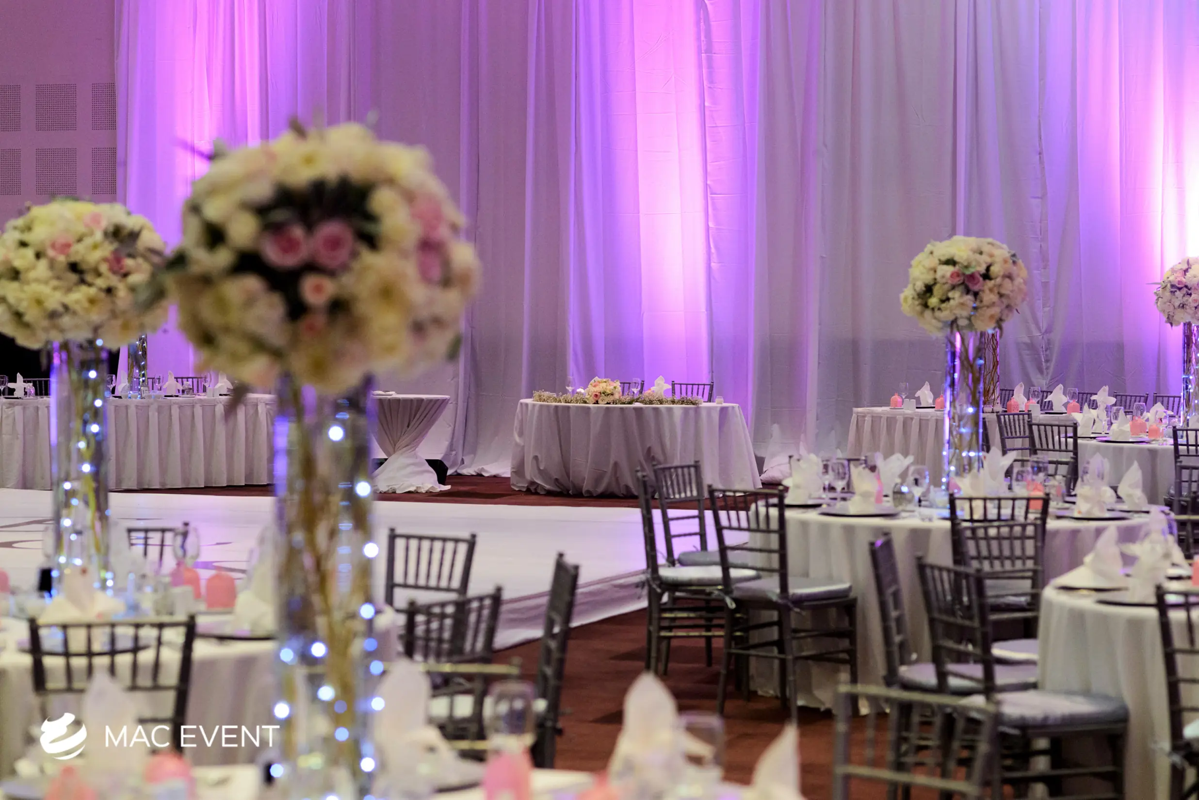 Create the perfect mood for your wedding with lighting that enhances every moment. Soft ambient glows for the ceremony, elegant lighting for dinner, and high energy effects for the dance floor. Our lighting design highlights your decor, venue architecture, and photo moments with beautiful visual impact.